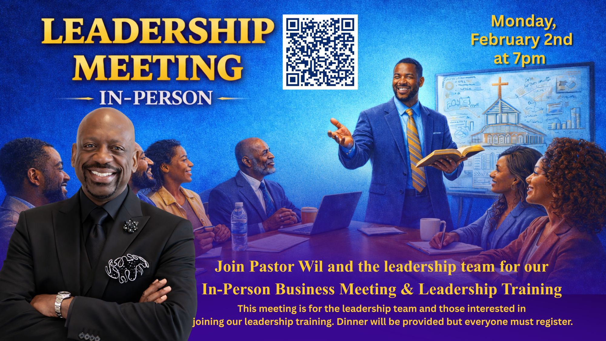Pastor Wil and the Leadership Team invite anyone interested in serving in leadership to join us for an in-person Business Meeting and Leadership Training on February 2nd at 7:00 PM. This evening will be a great opportunity to learn more about our vision, grow in leadership, and connect with the team. Dinner will be provided.